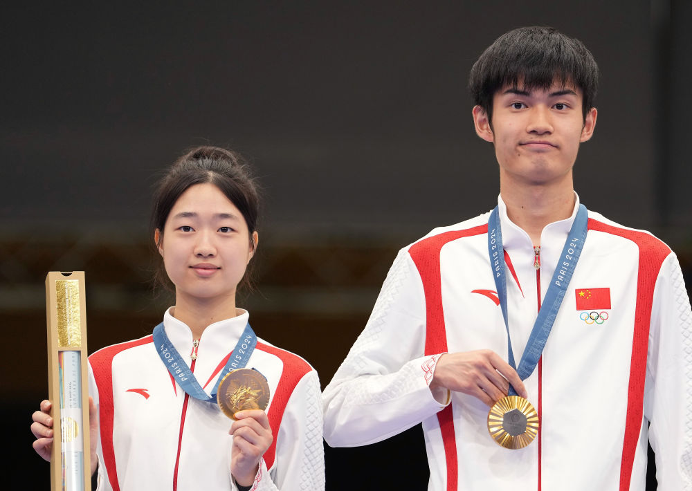 7月27日,冠軍中國選手黃雨婷(左)/盛李豪在頒獎儀式上。當(dāng)日,在法國沙托魯舉行的巴黎奧運會射擊10米氣步槍混合團(tuán)體決賽中,中國選手黃雨婷/盛李豪奪冠,贏得巴黎奧運會首枚金牌。新華社記者 鞠煥宗 攝