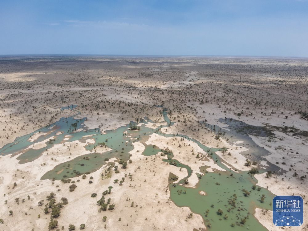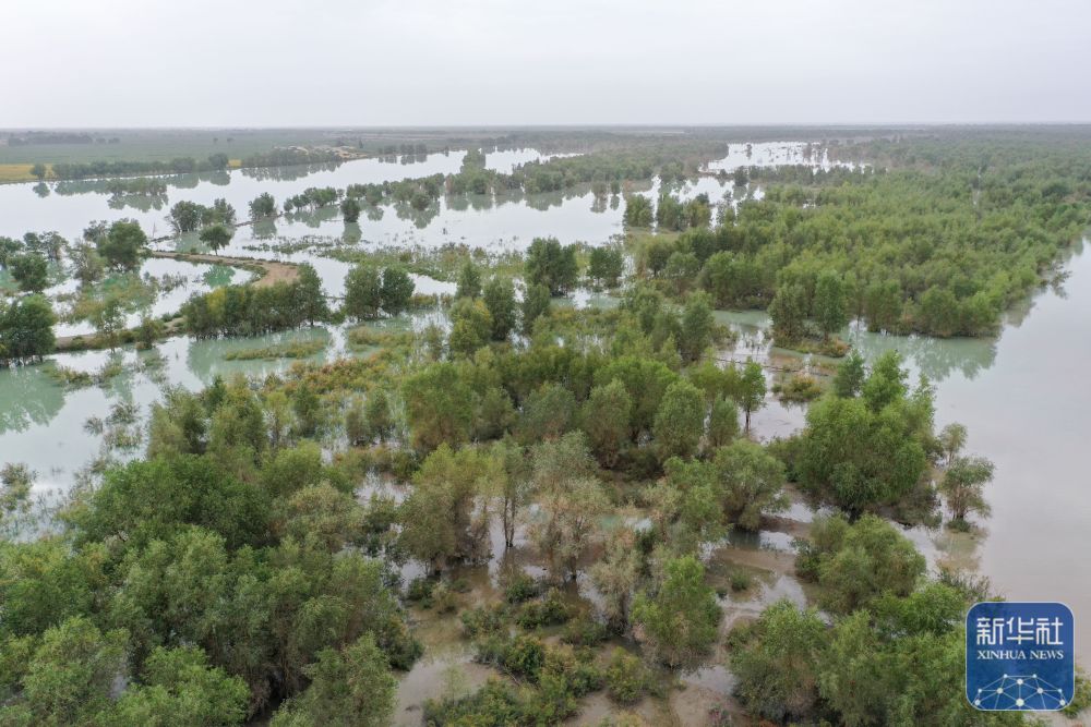 ↑8月3日拍攝的利用塔里木河洪水灌溉阿克蘇地區(qū)沙雅縣天然胡楊林的場景(無人機照片)。