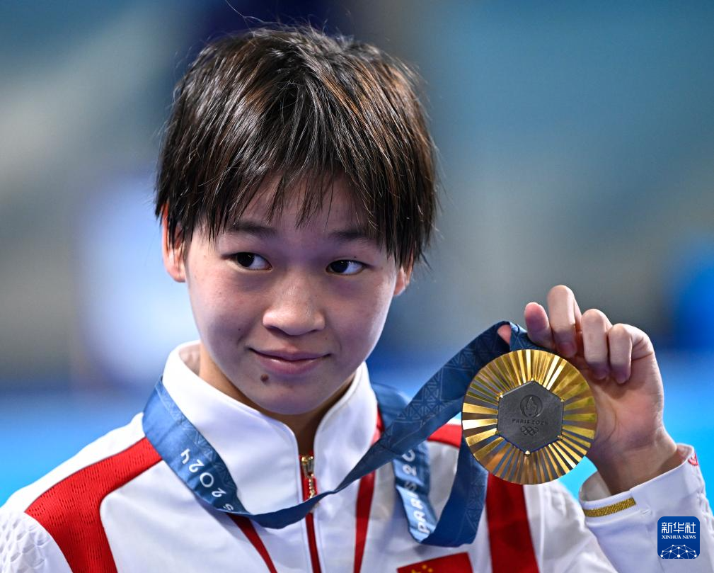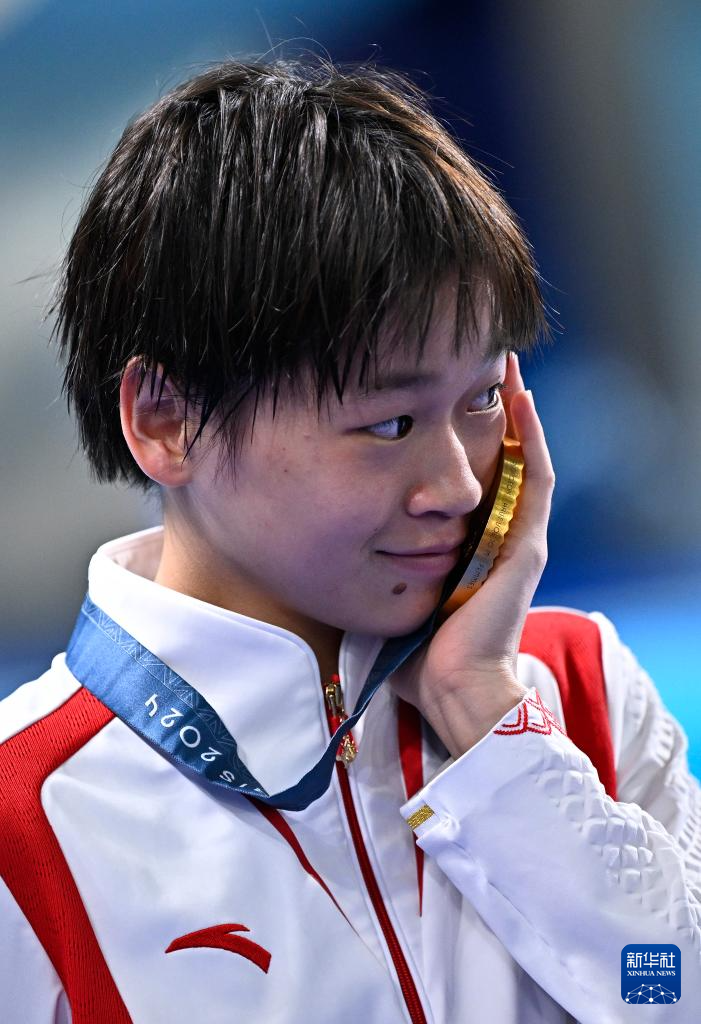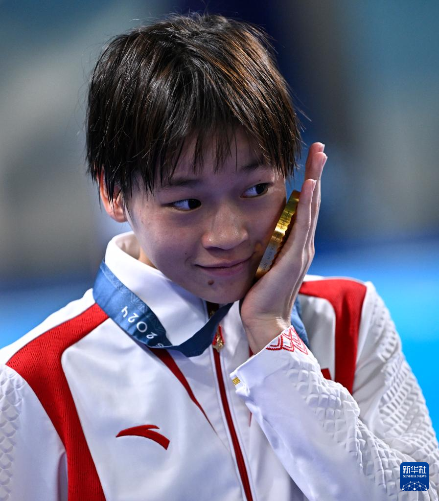 8月6日,全紅嬋展示金牌。新華社記者 王鵬 攝