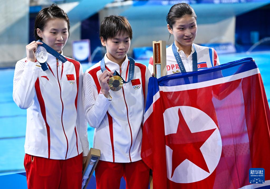 8月6日,冠軍中國選手全紅嬋(中)、亞軍中國選手陳芋汐(左)、季軍朝鮮選手金姬燕在頒獎儀式后合影。新華社記者 王鵬 攝