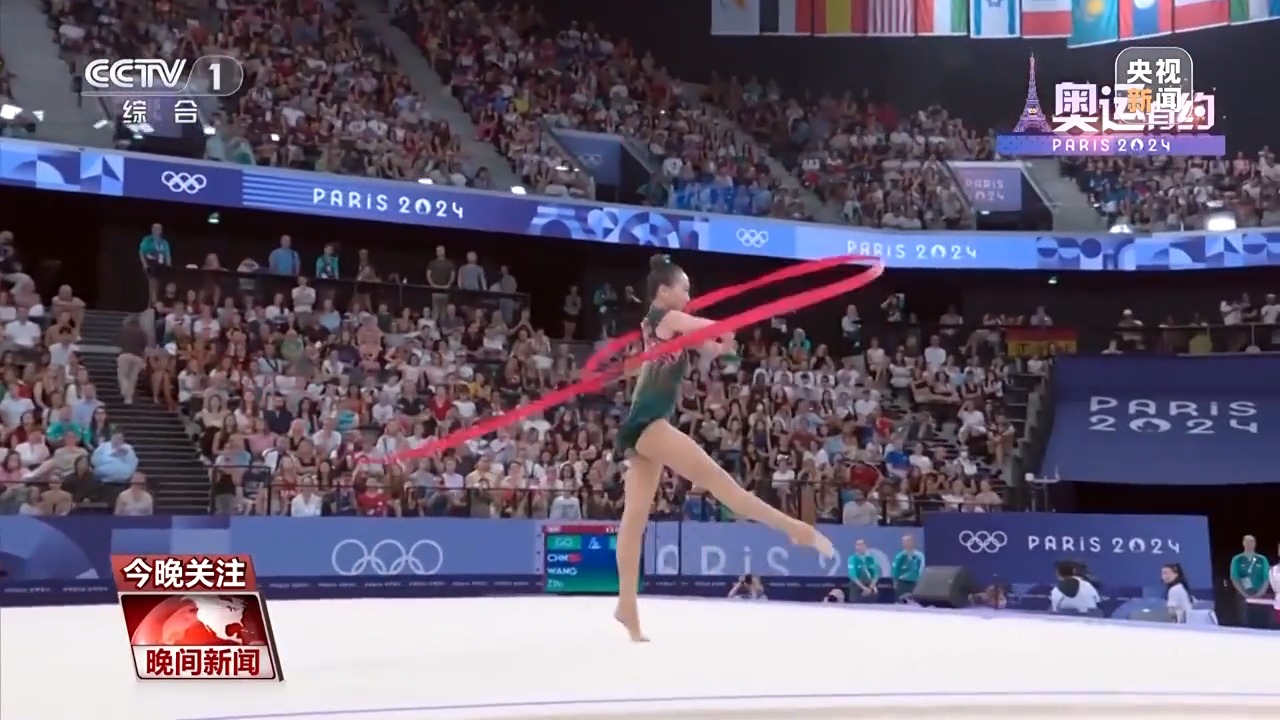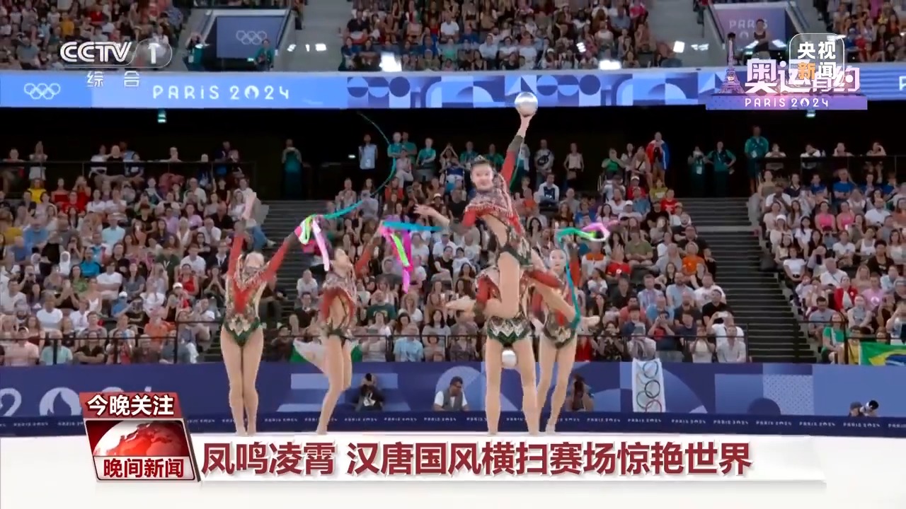 而在藝術體操女子團體全能決賽中,中國藝術體操的姑娘們以總分69.8分,拿下該項目的金牌。在決賽三帶兩球項目《鳳鳴凌霄》表演中,伴隨著動聽的音樂,姑娘們靈活地運用彩帶和球,以精準的動作、極具張力的表演,詮釋了漢唐國風的民族美學。