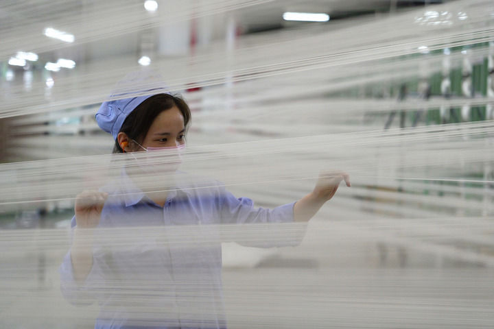 工作人員在位于河南省平頂山市的中國平煤神馬集團簾子布發(fā)展公司布機車間檢查絲線情況(2024年3月28日攝)。中國平煤神馬集團積極延伸煤炭產(chǎn)業(yè)鏈,普通的煤炭被加工成眾多高附加值衍生產(chǎn)品。