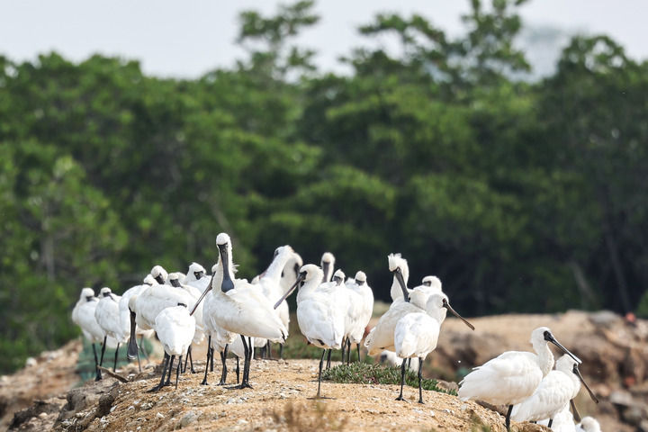一群黑臉琵鷺在海南新盈紅樹林國家濕地公園休憩(2023年12月27日攝)。
