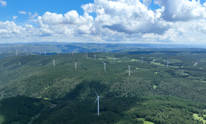 這是河北省圍場滿族蒙古族自治縣御道口鎮(zhèn)附近的風(fēng)電場(2024年7月26日攝,無人機照片)。