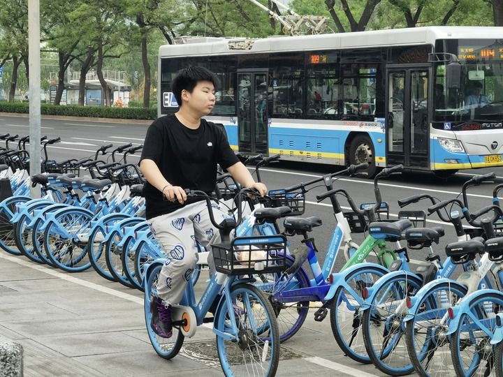 北京街頭,一名年輕人使用共享單車出行(2024年4月22日攝)。
