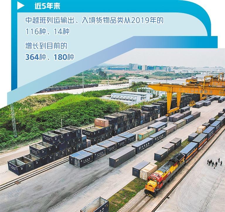 數(shù)據(jù)表明,高效、實惠、便捷的中越班列已得到市場認可。近5年來,中越班列運輸出、入境貨物品類從2019年的116種、14種,增長到目前的364種、180種。中越班列集貨地已覆蓋廣西及周邊省份20多個地市,跨境貨物運輸覆蓋越南、老撾、泰國等多個東盟國家。