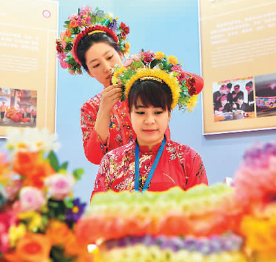 2月2日,兩名女孩在2024中國(guó)—東盟人文交流年展覽活動(dòng)上展示福建蟳埔女頭飾。新華社記者 姜克紅攝