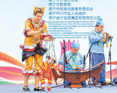 四月十二日,在第二屆中國(guó)—東盟(南寧)非物質(zhì)文化遺產(chǎn)周上,演員們進(jìn)行非遺展演。彭寰攝(人民圖片)
