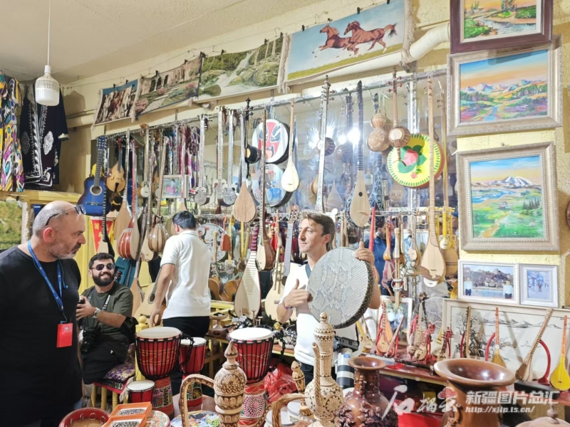 土耳其媒體人在喀什古城木器巴扎店內(nèi)參觀。石榴云/新疆日?qǐng)?bào)記者 宋海波攝