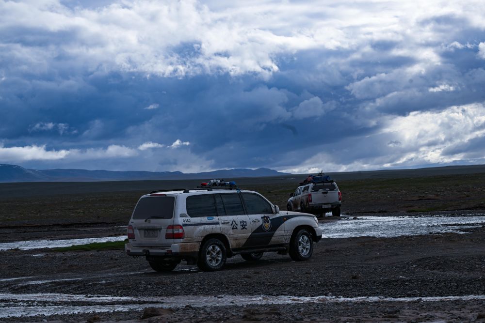 可可西里的夏季可謂一天見四季,十里不同天。初入無(wú)人區(qū)還是晴空萬(wàn)里,走了十幾公里后車隊(duì)就被烏云籠罩,分不清是雨點(diǎn)還是冰雹,噼里啪啦地砸向車窗。