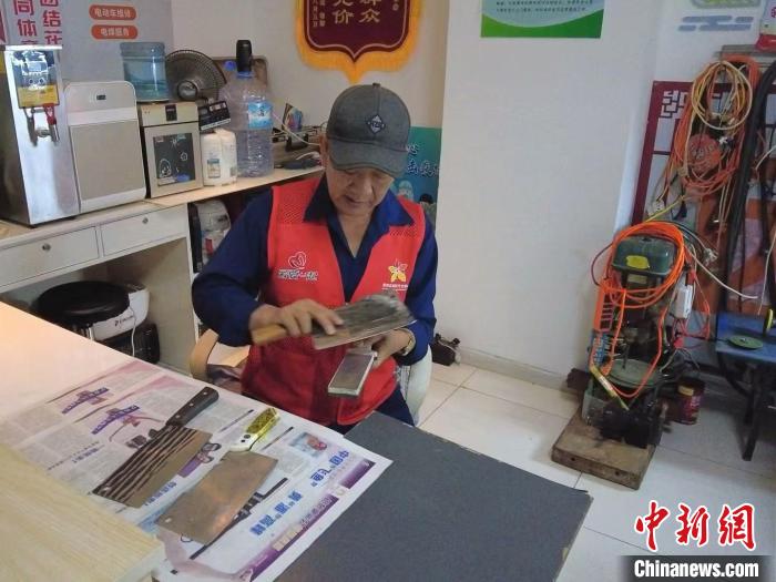 日前,“鑄牢共同體 中華一家親”主題宣傳“塞上江南寫新篇”集中采訪團(tuán)走進(jìn)寧夏銀川市金鳳區(qū)黃河?xùn)|路街道的頤和城府社區(qū)。圖為智福德正在為社區(qū)居民打磨刀具。中新網(wǎng)記者 劉玥晴 攝