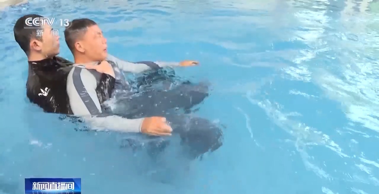 國(guó)家消防救援局水域救援訓(xùn)練基地教練員 李勝龍:我們不要正面游向他,要盡量從他的背后,然后靠近他的時(shí)候要轉(zhuǎn)動(dòng)他的髖部,使他背向我,因?yàn)槟缢咚诨艁y的時(shí)候會(huì)抓緊我們的身體,也就是我們俗稱的“抓緊最后一根稻草”。他會(huì)死死抓住我們,影響我們的救援,所以說(shuō)我們要從背后接近他,然后托住他的頭部 、頸部,使他的頭部始終露出水面,降低他的恐慌。