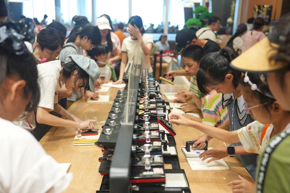 游客在湖南博物院博物館公園體驗文創(chuàng)產(chǎn)品。新華社記者 薛宇舸 攝