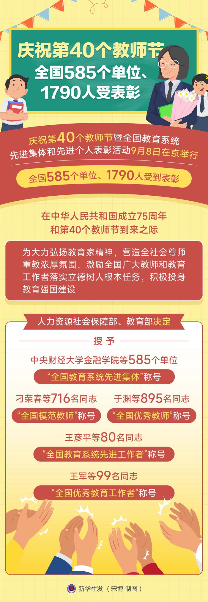 在中華人民共和國(guó)成立75周年和第40個(gè)教師節(jié)到來(lái)之際,為大力弘揚(yáng)教育家精神,營(yíng)造全社會(huì)尊師重教濃厚氛圍,激勵(lì)全國(guó)廣大教師和教育工作者落實(shí)立德樹(shù)人根本任務(wù),積極投身教育強(qiáng)國(guó)建設(shè),人力資源社會(huì)保障部、教育部決定授予中央財(cái)經(jīng)大學(xué)金融學(xué)院等585個(gè)單位“全國(guó)教育系統(tǒng)先進(jìn)集體”稱號(hào);授予刁榮春等716名同志“全國(guó)模范教師”稱號(hào);授予于淵等895名同志“全國(guó)優(yōu)秀教師”稱號(hào);授予王彥平等80名同志“全國(guó)教育系統(tǒng)先進(jìn)工作者”稱號(hào);授予王軍等99名同志“全國(guó)優(yōu)秀教育工作者”稱號(hào)。