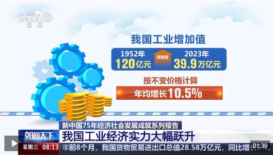 國(guó)家統(tǒng)計(jì)局昨天(10日)發(fā)布的新中國(guó)75年經(jīng)濟(jì)社會(huì)發(fā)展成就系列報(bào)告顯示,新中國(guó)成立75年以來(lái),我國(guó)工業(yè)經(jīng)濟(jì)實(shí)現(xiàn)了規(guī)??偭康目缭绞皆鲩L(zhǎng)和發(fā)展質(zhì)量的顯著提升,由農(nóng)業(yè)國(guó)成長(zhǎng)為世界第一制造業(yè)大國(guó)。