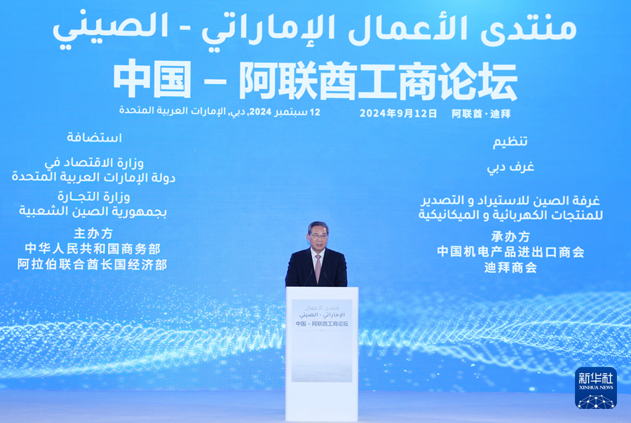 當(dāng)?shù)貢r間9月12日下午,國務(wù)院總理李強在迪拜出席中國-阿聯(lián)酋工商論壇并致辭。新華社記者 姚大偉 攝