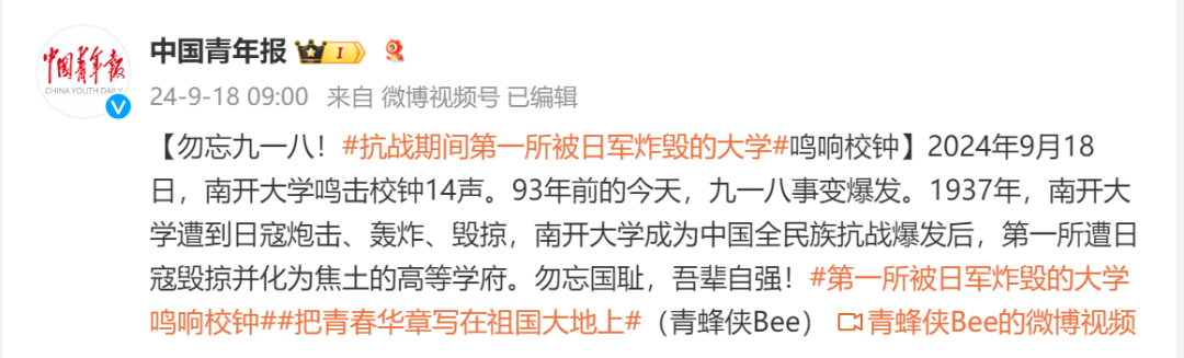 今天是九一八事變爆發(fā)93周年,南開大學鳴擊校鐘14聲。