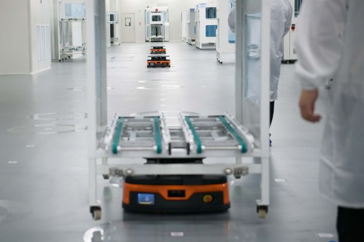 8月20日,在安徽華晟新能源科技股份有限公司的異質(zhì)結(jié)光伏電池及組件工廠內(nèi),搬運(yùn)機(jī)器人在作業(yè)。