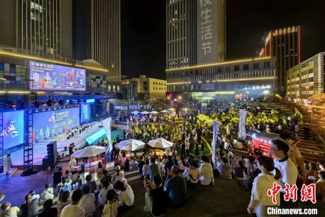 8月2日晚,由天津市商務(wù)局、天津市文化和旅游局、天津市體育局共同主辦的第五屆天津夜生活節(jié)啟幕。圖為民眾在啟動(dòng)儀式上觀看文藝演出。中新社記者 佟郁 攝