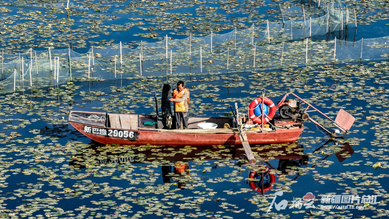 9月20日,養(yǎng)殖戶在博斯騰湖上捕撈螃蟹(無人機(jī)攝)。石榴云/新疆日報記者 周鵬攝