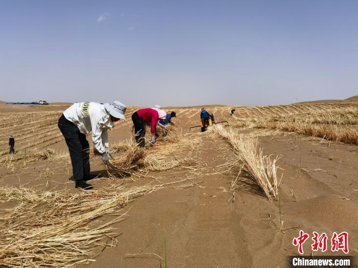 2024年6月,河西走廊—塔克拉瑪干沙漠邊緣阻擊戰(zhàn)工程固沙現(xiàn)場(chǎng)。 (阿拉善右旗宣傳部供圖)