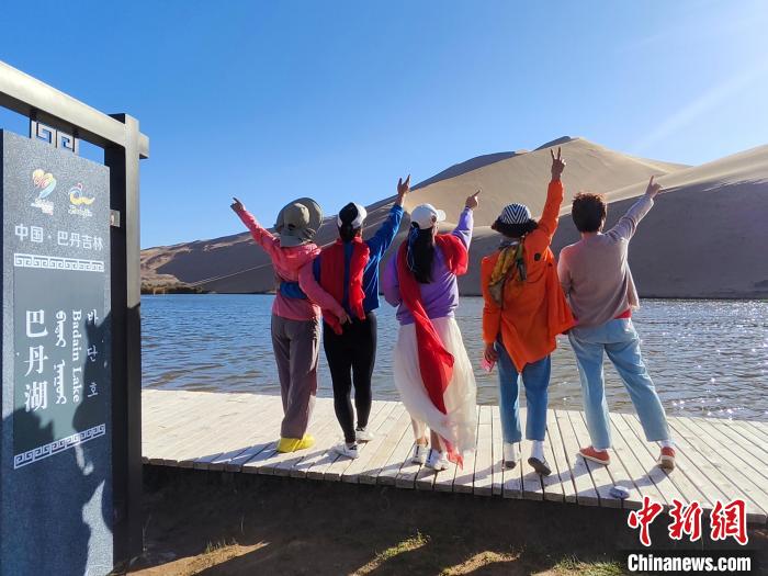 9月21日,來(lái)自天津的游客在巴丹湖邊留下合影。 中新社記者 陳溯 攝