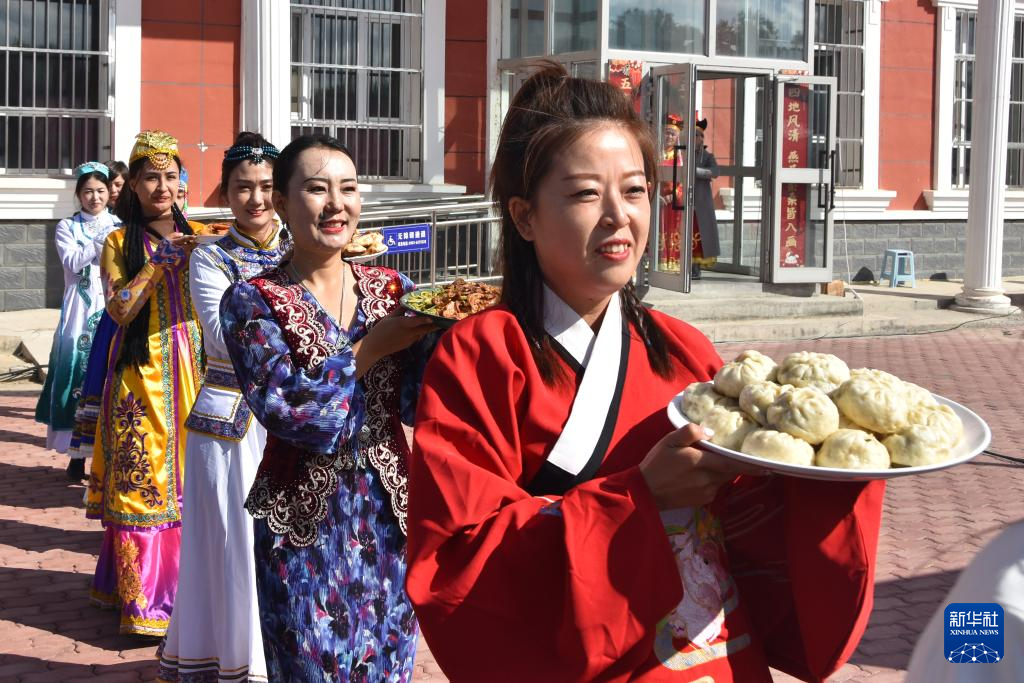 9月27日,在新疆塔城市新城街道哈爾墩社區(qū)舉行的“鄰里節(jié)百家宴”現(xiàn)場,社區(qū)居民展示自己制作的美食。