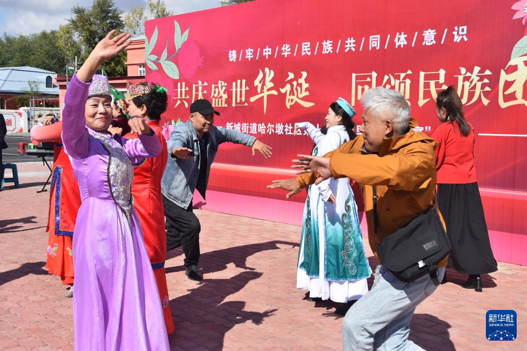 9月27日,在新疆塔城市新城街道哈爾墩社區(qū)舉行的“鄰里節(jié)百家宴”現(xiàn)場,社區(qū)居民在表演。
