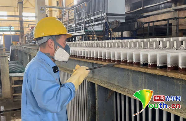 柳祥國在檢查陰極板導電頭。中國青年網(wǎng)記者 高蕾 攝