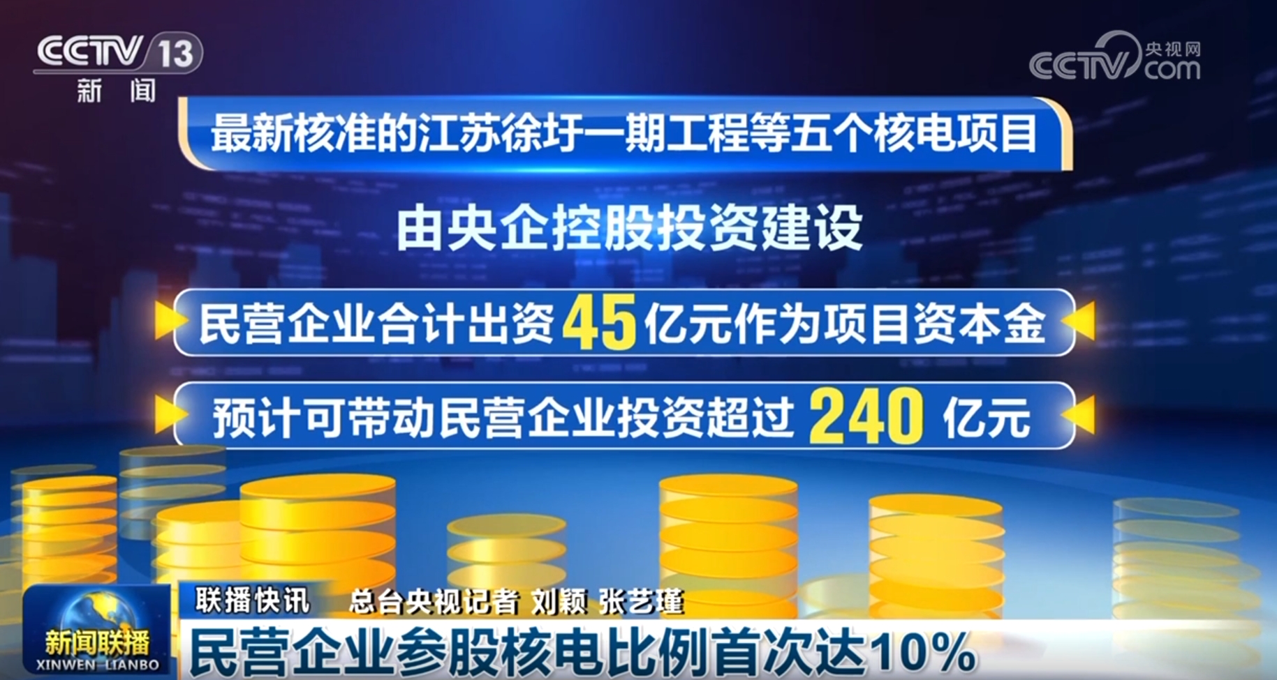 記者從國家發(fā)展改革委了解到,近期國務(wù)院核準(zhǔn)的江蘇徐圩一期工程等五個(gè)核電項(xiàng)目,由央企控股投資建設(shè),民營企業(yè)合計(jì)出資45億元作為項(xiàng)目資本金,預(yù)計(jì)可帶動(dòng)民營企業(yè)投資超過240億元。民營企業(yè)參股核電的比例首次提高到了10%,核電領(lǐng)域進(jìn)一步向民資放開。