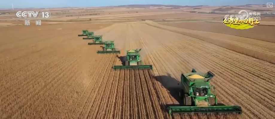 在呼倫貝爾甘河農(nóng)牧場的大豆田里,6臺大型收割機在金色的田野里繁忙作業(yè),這里地勢開闊,每臺收割機每天可收割1000畝大豆。