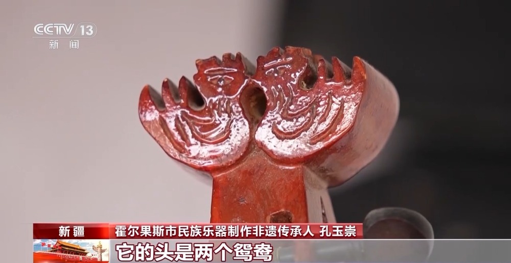 霍爾果斯市民族樂(lè)器制作非遺傳承人 孔玉崇:鴛鴦是很美好的,它有兩個(gè)腹板,也可以互為背板。它的頭是兩個(gè)鴛鴦,在一個(gè)腿上可以彈,坐著也可以拉,很方便。你帶著這么一把琴就等于帶了兩把琴,因?yàn)樗囊灿?,彈的也有?/p>
