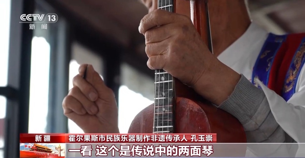 霍爾果斯市民族樂(lè)器制作非遺傳承人 孔玉崇:老人畫(huà)了一個(gè)圖,他問(wèn)我,這樣的一個(gè)琴你能不能做。我一看,這個(gè)是傳說(shuō)中的兩面琴,我說(shuō)我做,就這樣開(kāi)始了。