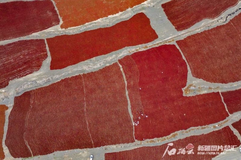 10月3日,種植戶在沙灣市安集海鎮(zhèn)萬(wàn)畝天然曬場(chǎng)翻曬辣椒(無(wú)人機(jī)攝)。