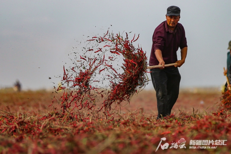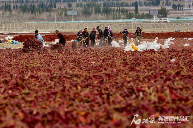 10月3日,種植戶在沙灣市安集海鎮(zhèn)萬(wàn)畝天然曬場(chǎng)翻曬辣椒。