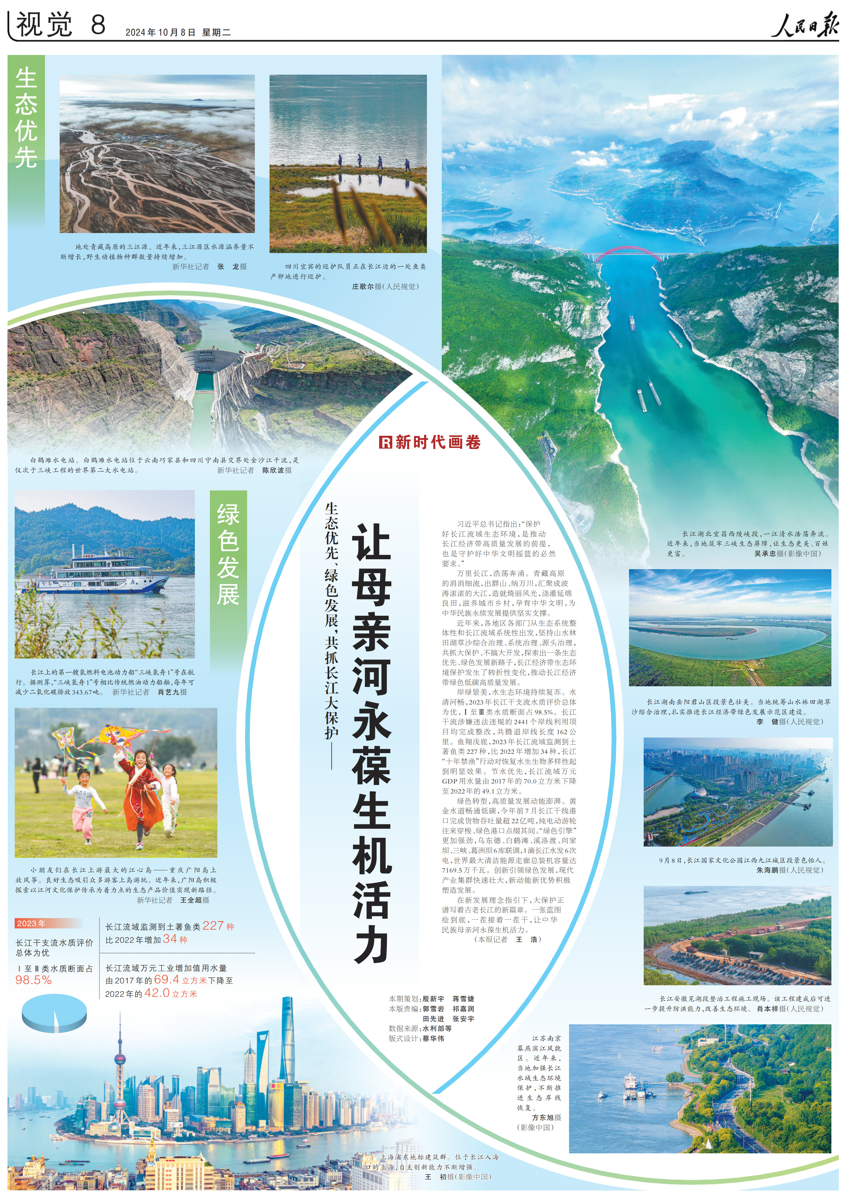 岸綠景美,水生態(tài)環(huán)境持續(xù)復(fù)蘇。水清河暢,2023年長江干支流水質(zhì)評價(jià)總體為優(yōu),Ⅰ至Ⅲ類水質(zhì)斷面占98.5%。長江干流涉嫌違法違規(guī)的2441個(gè)岸線利用項(xiàng)目均完成整改,共騰退岸線長度162公里。魚翔淺底,2023年長江流域監(jiān)測到土著魚類227種,比2022年增加34種,長江“十年禁漁”行動對恢復(fù)水生生物多樣性起到明顯效果。節(jié)水優(yōu)先,長江流域萬元GDP用水量由2017年的70.0立方米下降至2022年的49.1立方米。