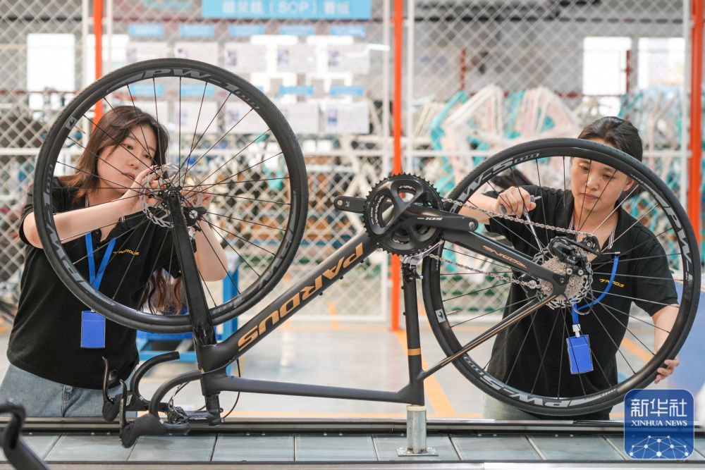 2024年7月8日,在山東泰山瑞豹復(fù)合材料有限公司生產(chǎn)車間,工人在組裝碳纖維自行車。位于山東樂(lè)陵經(jīng)濟(jì)開發(fā)區(qū)的泰山體育產(chǎn)業(yè)集團(tuán)為2024巴黎奧運(yùn)會(huì)的摔跤、自行車、跆拳道、體操、田徑等比賽提供器材。新華社記者 朱崢攝