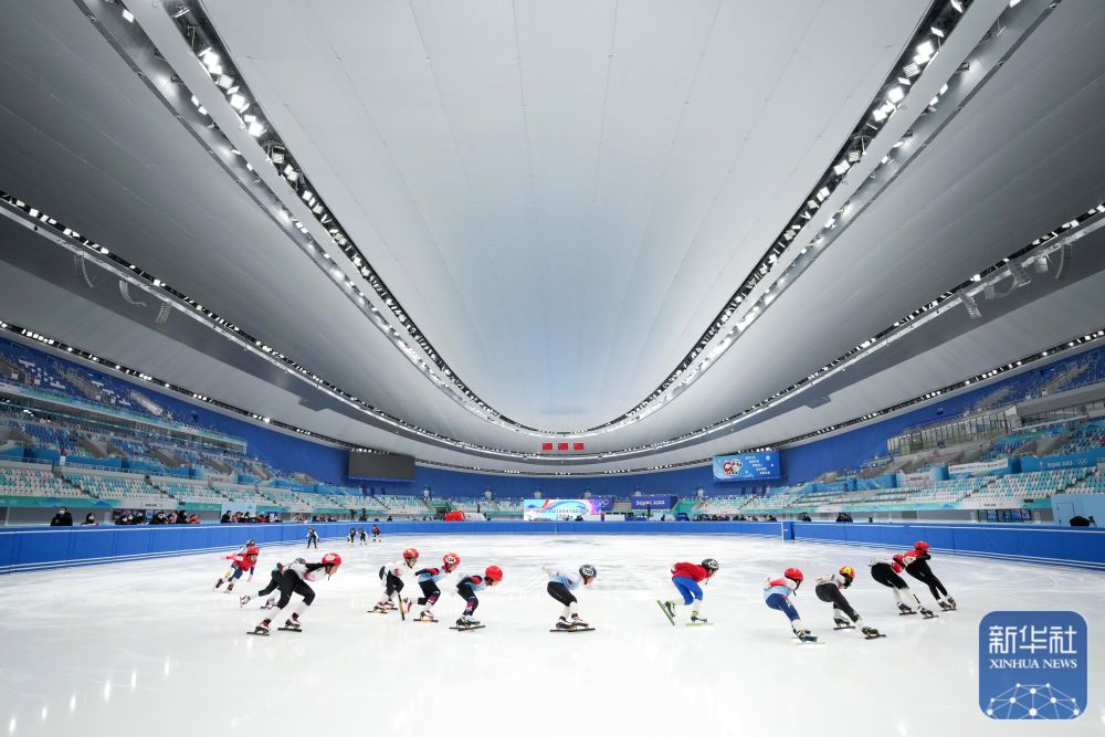 2023年1月6日,小朋友們?cè)趪?guó)家速滑館進(jìn)行短道速滑訓(xùn)練展示。新華社記者 鞠煥宗攝