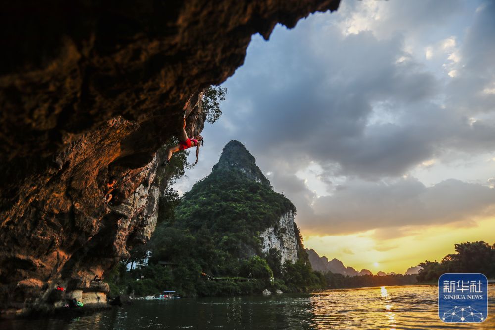 2023年9月5日,攀巖愛(ài)好者在廣西桂林市陽(yáng)朔縣進(jìn)行深水抱石。新華社記者 胡星宇 攝