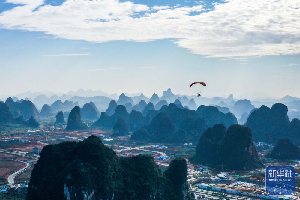 游客在廣西桂林市陽(yáng)朔縣體驗(yàn)動(dòng)力滑翔傘(2019年11月14日攝,無(wú)人機(jī)照片)。 新華社記者 曹祎銘 攝