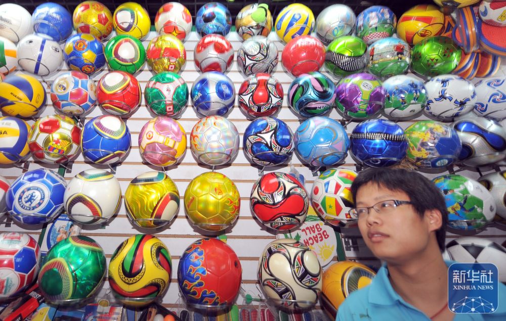 2010年6月23日,一位顧客正在浙江義烏小商品市場(chǎng)內(nèi)選購(gòu)足球。據(jù)義烏海關(guān)統(tǒng)計(jì),受南非世界杯帶動(dòng),當(dāng)?shù)伢w育用品的月度出口額連續(xù)半年超過(guò)1000萬(wàn)美元,2010年前5個(gè)月的出口額比前一年同期增長(zhǎng)110%。 新華社記者 王定昶 攝