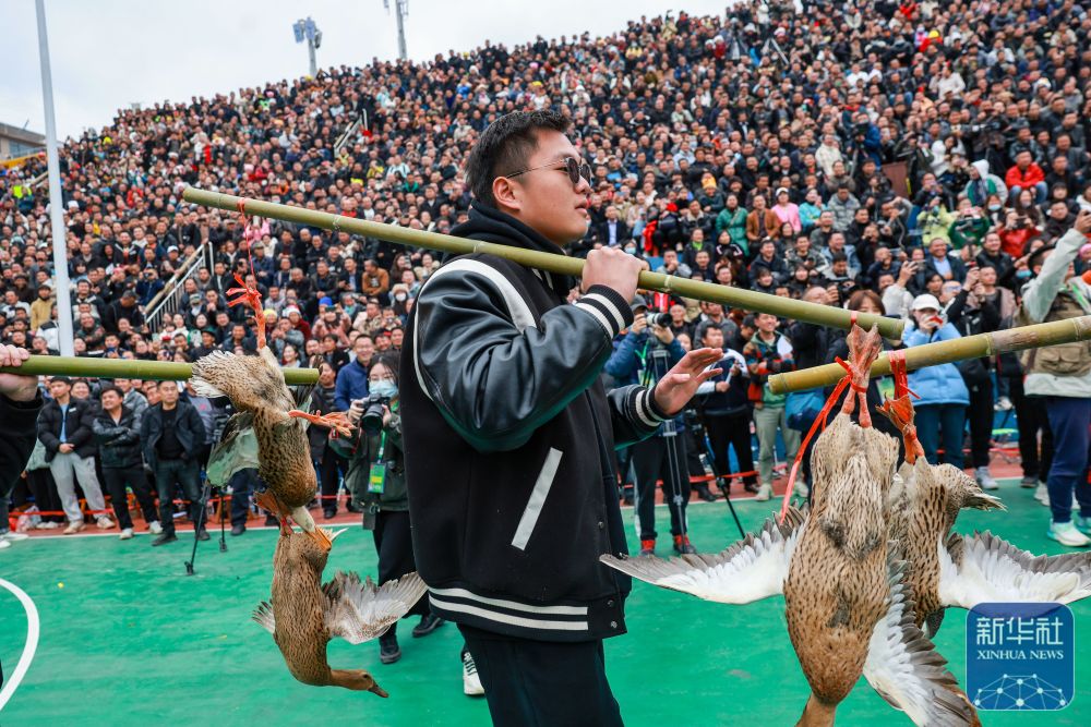 2023年3月27日,村民挑著當(dāng)?shù)剞r(nóng)特產(chǎn)品“三穗麻鴨”進(jìn)入賽場(chǎng)。這是季軍銅仁市代表隊(duì)的獎(jiǎng)品。 當(dāng)日,貴州省首屆“美麗鄉(xiāng)村”籃球聯(lián)賽總決賽在黔東南州臺(tái)江縣臺(tái)盤村舉行。新華社記者 歐東衢 攝