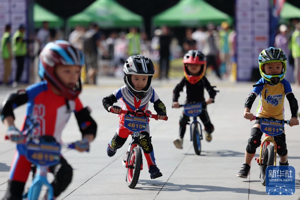 2024年6月22日小選手寒博赟(左二)在比賽中騎行。當(dāng)日,2024甘肅省兒童平衡車童車聯(lián)賽在甘肅省蘭州市甘肅大劇院廣場(chǎng)開賽。新華社記者 陳斌 攝
