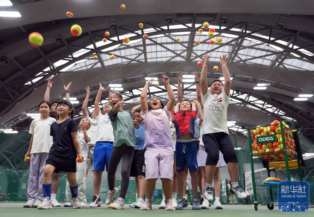 2024年8月14日,在北京一家網(wǎng)球俱樂(lè)部,小學(xué)員在結(jié)束網(wǎng)球暑期夏令營(yíng)的課程后合影。 新華社記者 才揚(yáng) 攝