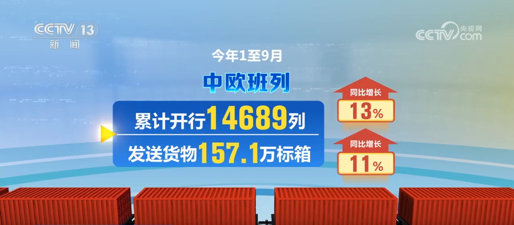 數(shù)據(jù)顯示,今年1至9月,中歐班列累計開行14689列,發(fā)送貨物157.1萬標箱,同比分別增長13%、11%。其中9月份開行1633列,發(fā)送貨物17.1萬標箱,同比分別增長15%、12%。