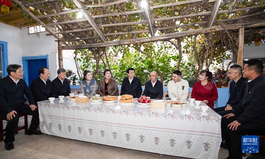 10月21日至24日,中共中央政治局常委、全國政協(xié)主席王滬寧在新疆和田、喀什調(diào)研。這是23日下午,王滬寧在疏勒縣塔孜洪鄉(xiāng)臺吐爾村同干部群眾交流。新華社記者 李濤 攝