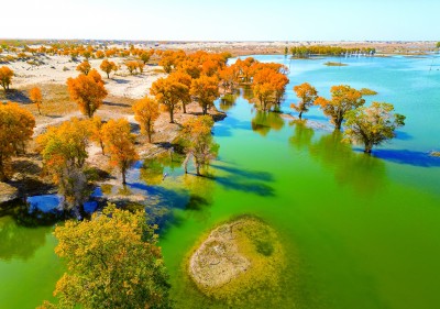 站在高處放眼望去,大片的胡楊林仿佛被溫柔的霞光所籠罩,明黃色的胡楊葉如同滿天繁星,在水面上輕輕搖曳。走進胡楊林深處,可見漢唐烽燧、太陽墓、祭臺,每一處文化遺存都透著原始與神秘,仿佛將一個個古老的傳說向人娓娓道來。