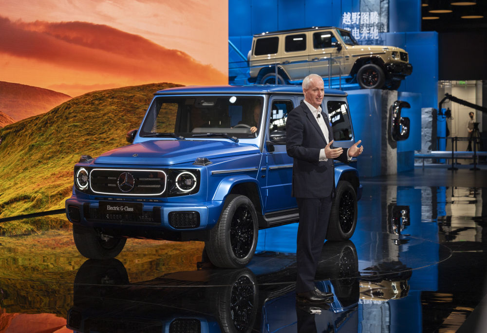 2024年4月25日,在北京中國國際展覽中心順義館舉行的2024北京車展上,梅賽德斯—奔馳集團(tuán)股份公司董事會(huì)成員唐仕凱介紹梅賽德斯—奔馳純電G級(jí)越野車。新華社記者才揚(yáng)攝