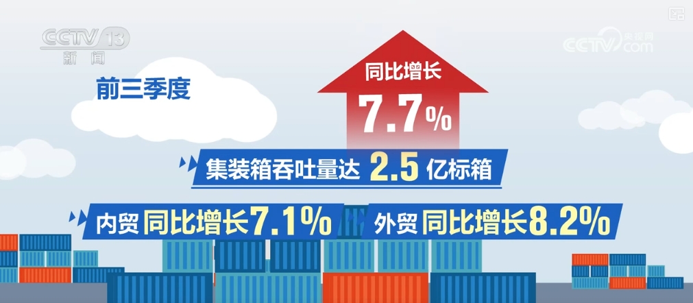 前三季度,全國(guó)港口貨物吞吐量129.7億噸,同比增長(zhǎng)3.4%。其中,內(nèi)貿(mào)、外貿(mào)同比分別增長(zhǎng)1.7%和7.6%。集裝箱吞吐量達(dá)2.5億標(biāo)箱,同比增長(zhǎng)7.7%。其中,內(nèi)貿(mào)、外貿(mào)同比分別增長(zhǎng)7.1%和8.2%。