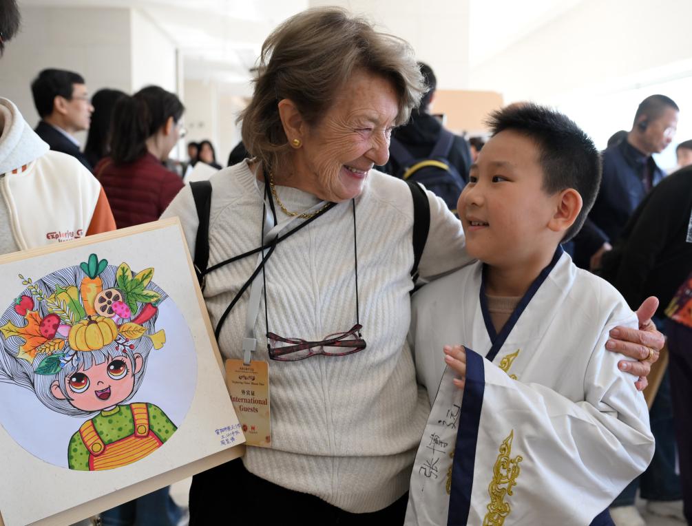 11月5日,外賓在河南省安陽(yáng)市殷墟博物館與一名小朋友交流。新華社記者 李嘉南 攝